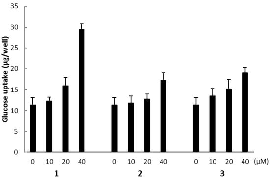 L6 myotubes were incubated in filter-sterilized Krebs-Henseleit buffer (1.2 mM MgSO4, 1.2 mM KH2PO4, 4.7 mK KCl, 119 mM NaCl, 2.5 mM CaCl2·2H2O, and 25 mM NaHCO3, pH 7.4) containing 0.1% bovine serum albumin (BSA), 10 mM HEPES, and 2 mM sodium pyruvate (KHH buffer) for 2 h. The myotubes were then cultured in KHH buffer containing 5 mM glucose with or without compounds 1, 2, and 3 (10–40 µM) for 16 h and without or with compound C (30 µM), an AMPK inhibitor for 6 h. Nepodin [] was used as a positive control, and DMSO alone was used as a negative control. The concentrations of glucose remaining in KHH buffer were determined by a commercial assay kit (Glucose CII-Test Wako) and a microplate reader at 490 nm. The amounts of glucose uptake by myotubes were calculated from the differences in glucose concentrations between before and after culture.