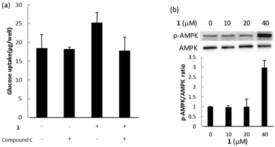 The biological activities of compounds 1, 2, and 3 were evaluated using a glucose uptake assay in cultured L6 myotubes. Compound 1 stimulated glucose uptake in a dose-dependent and insulin-independent manner, and compounds 2 and 3 showed weak activity for glucose uptake (Figure 9). To confirm the involvement of AMP-activated protein kinase (AMPK), which increases insulin-independent glucose uptake in skeletal muscle [,], we examined the effect of compound C, a selective AMPK inhibitor and performed western blotting with anti-AMPK and anti-phosphorylated AMPK (p-AMPK) antibodies. Compound C markedly lowered glucose uptake stimulated by compound 1 in cultured L6 myotubes (Figure 10a). The expression of p-AMPK (the activated form of AMPK) increased in the cells treated with 40 μM of 1 (Figure 10b). These results indicate that compound 1 stimulated glucose uptake in cultured L6 myotubes via the AMPK pathway, regulating cellular metabolism.