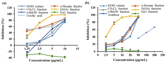 (a) PTP1B and (b) α-glucosidase inhibitory activity of the EtOH extract from S. serratifolium and its various fractions. Error bars indicate the standard error of the mean (SEM).