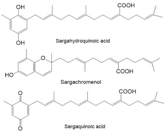 Sargassum serratifolium was collected along the coast of Busan, South Korea in April 2014. Specimen identity was confirmed by an algal biologist (N. G. Kim) at the Department of Marine Biology and Aquaculture, Gyeongsang National University, South Korea. Dried seaweed (3.5 kg) was extracted twice with 95% (v/v) ethanol (6 L/each) at 70 °C for 3 h. The ethanolic extract (250.3 g) was obtained after concentration under reduced pressure and was then suspended in water (3:1). The suspension was successively partitioned with n-hexane, CH2Cl2, EtOAc, and n-BuOH to yield the n-hexane (86.5 g), CH2Cl2 (36 g), EtOAc (22.6 g), and n-BuOH (37.2 g) fractions, respectively, as well as the H2O residue (55.3 g). Sargahydroquinoic acid, sargachromenol and sargaquinoic acid were isolated from n-hexane fraction according to the method described by Joung et al. [17], and identified by direct comparison with authentic samples (1H- and 13C-NMR). The purity of all compounds was determined to be higher than 99% by HPLC-Q-TOF-MS analysis. The structures of these compounds are shown in Figure 2.