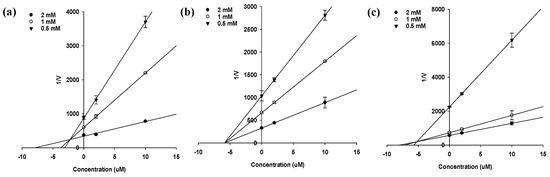 Dixon plots for PTP1B inhibition of compounds. (a) sargahydroquinoic acid; (b) sargachromenol and (c) sargaquinoic acid were tested in the presence of different concentrations of substrate: 2.0 mM (●); 1.0 mM (ο); 0.5 mM (▼).