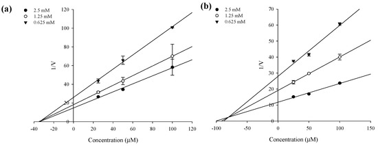 Dixon plots for α-glucosidase inhibition of compounds. (a) sargachromenol and (b) sargaquinoic acid were tested in the presence of different concentrations of substrate: 2.5 mM (●); 1.25 mM (ο); 0.625 mM (▼).
