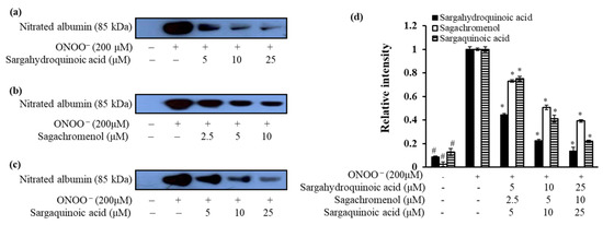 Dose-depended inhibition of ONOO−-mediated albumin nitration by plastoquinones. Mixtures of test samples, bovine serum albumin (BSA), and ONOO− were incubated with shaking at 37 °C for 30 min. The reactant was resolved in 10% polyacrylamide gel via electrophoresis. (a) sargahydroquinoic acid; (b) sargachromenol; and (c) sargaquinoic acid were used at the indicated concentrations; (d) Quantification of band intensity was calculated using CS Analyzer 3.00 (ATTO Corp., Tokyo, Japan). # p < 0.05 indicates a significant difference from the untreated normal group, * p < 0.05 indicate significant differences from the ONOO− treated control.