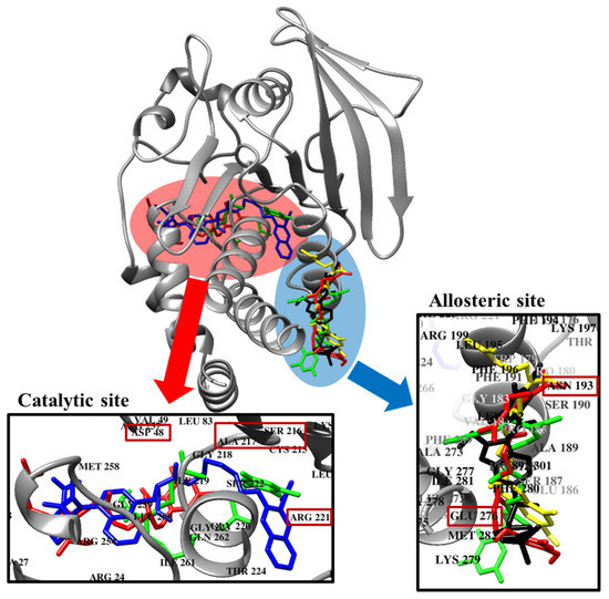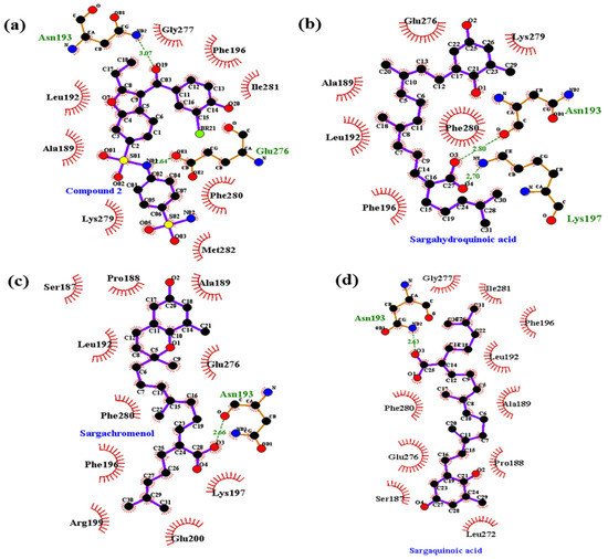 In order to confirm the inhibition mode of the PTP1B enzyme, we predicted the 3D structure of PTP1B using AutoDock 4.2 to simulate the binding of three plastoquinones and compound 23, a PTP1B enzyme inhibitor [59]. Compound 23 is among the most potent non-peptic PTP1B catalytic inhibitor reported to date. Moreover, we also predicted the 3D structure of PTP1B using AutoDock 4.2 to simulate the binding of these plastoquinones and compound 2, a PTP1B allosteric inhibitor [7]. The AutoDock 4.2 docking program was used to predict protein–ligand binding interactions. Currently, automated docking is widely used as an effective means of quick and accurate prediction of biomolecular conformation and binding energy of protein–ligand complexes in molecular design. The molecular docking models of sargahydrogquinoic acid, sargachromenol, sargaquinoic acid, compound 23, and compound 2 are illustrated in Figure 6. Ligand–enzyme complexes with three plastoquinones/or compound 2 were stably posed in the same pocket of PTP1B by AutoDock 4.2. As illustrated in Figure 7b, in the corresponding ligand interactions of sargahydrogquinoic acid at the active site of PTP1B, there are two hydrogen-bonding interactions with two important residues (Asn193 COOH and Lys197 COOH) of the enzyme, and sargaquinoic acid also bound at catalytic site of PTP1B (Figure 8c). In the case of sargachromenol, an important residue of the enzyme (Asn193 COOH) participated in the hydrogen-bonding interaction (Figure 7c). Moreover, an important residue of the enzyme (Asn193 COOH) participated in the hydrogen-bonding interaction and residues of allosteric site of PTP1B interacted with sargaquinoic acid (Figure 7d). Additionally, H-bonds are formed between the three compounds and the key Asn193 residue stabilizes these compounds and allows them to fit together at the enzyme allosteric site. Wiesmann et al. [7] also reported that the Ans193 residue in hydrogen bond formation is important for PTP1B allosteric inhibitors. Our results were in accordance with Wiesmann et al. [7], who suggested that the hydrogen bond formation with Asn193 is the minimum requirement for any compound to be considered an allosteric PTP1B inhibitor. In addition, the binding energy of plastoquinones was negative, indicating that hydrogen bonding may stabilize the open form of the enzyme and potentiate tight binding of the active site of PTP1B, resulting in more effective PTP1B inhibition. Taken together, the results of kinetic analysis and molecular docking simulation indicate that these three plastoquinones have promising anti-diabetic properties.