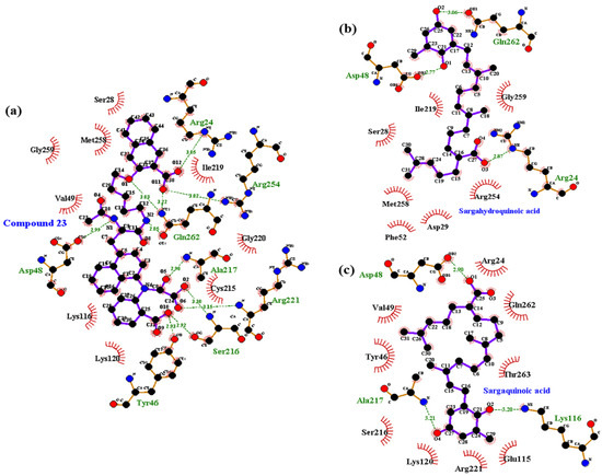 Molecular docking models for PTP1B catalytic inhibition of (a) compound 23; (b) sargahydroquinoic acid and (c) sargaquinoic acid.