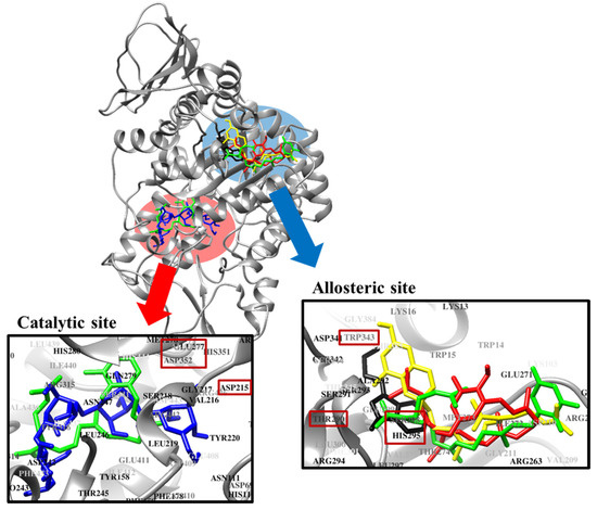 Molecular docking related to α-glucosidase inhibition by acarbose, BIP, sargahydroquinoic acid, sargachromenol and sargaquinoic acid. Binding sites of acarbose, BIP, sargahydroquinoic acid, sargachromenol and sargaquinoic acid are represented by blue, black, red, yellow and green colored structures, respectively.