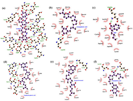 Molecular docking models for α-glucosidase inhibition by (a) acarbose; (b) sargaquinoic acid; (c) BIP; (d) sargahydroquinoic acid; (e) sargachromenol and (f) sargaquinoic acid.