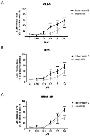 The levels of released lactate dehydrogenase (LDH) in the medium of lobocrassin B-treated cells. (A) CL1-5, (B) H520 and (C) BEAS-2b cells were incubated with lobocrassin B or etoposide for 24 h followed by LDH assays. The bar data shown represent the mean ± SD of samples from three wells. * p < 0.05; ** p < 0.01; *** p < 0.001 compared to control group (One-Way ANOVA). Data are representative of at least three independent experiments.
