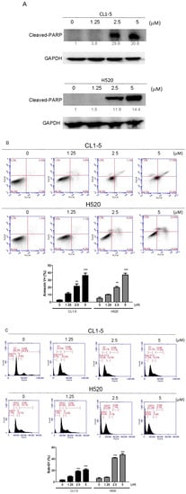 Incubation for 24 h with Lobocrassin B at concentrations of 2.5 and 5 μM strongly enhanced the (A) cleaved Poly (ADP-ribose) polymerase (PARP) expression, (B) Annexin V positive apoptotic cells, and (C) Sub-G1 population levels in CL1-5 and H520 cells. The bar data shown represent the mean ± SD of samples from three wells. ** p < 0.01; *** p < 0.001 compared to control group (One-Way ANOVA). Data are representative of at least three independent experiments.