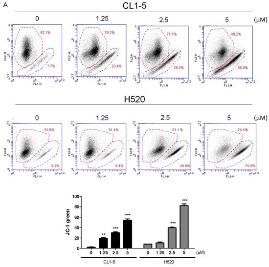 Cells (2 × 105/well) were subcultured into 6-well plates and treated with 1.25 and 2.5, 5 μM Lobocrassin B for 12 h. Thereafter, cells were suspended and incubated in 500 μL of dichlorodihydrofluorescein diace-tate (DCFH-DA, Molecular probes, Eugene, OR, USA) (10 μM) for ROS examination and 2 μM 5,5′,6,6′-tetra chloro-1,1′,3,3′-tetraethylbenzimidazolylcarbocyanine iodide (JC-1; Sigma-Aldrich, St. Louis, MO, USA) (10 µg/mL) for mitochondrial membrane potential in constant darkness at room temperature for 30 min. The samples were analyzed using a using an AccuriTM C5 cytometer.