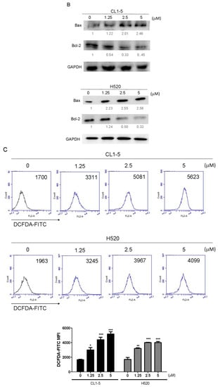 A 24 h incubation with Lobocrassin B at concentrations of 2.5 and 5 μM caused mitochondrial dysfunction and ROS accumulation in CL1-5 and H520 cells. (A) The dissipation of ΔΨm was observed detecting by stained with JC-1 dye and analyzed by flow cytometry. (B) Lobocrassin B enhanced the levels of Bax and reduced the expression of Bcl-2. The fold of band intensity compared to related controls was marked respectively. (C) Lobocrassin B also increased intracellular reactive oxygen species (ROS) levels by stained with DCFH-DA dye and analyzed by flow cytometry. The bar data shown represent the mean ± SD of samples from three wells. * p < 0.05; ** p < 0.01; *** p < 0.001 compared to control group (One-Way ANOVA). All data are representative of at least three independent experiments.