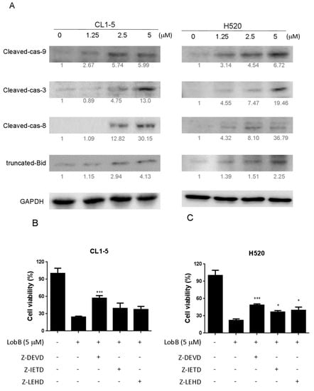 A 24 h incubation with Lobocrassin B at concentrations of 2.5 and 5 μM increased the (A) expression of cleaved capsae-9, cleaved capsae-8, cleaved capsae-3, and truncated Bid (tBID) in CL1-5 and H520 cells. The fold of band intensity compared to related controls was marked respectively. When (B) CL1-5 and (C) H520 cells were preincubated with inhibitors of caspase-3 (50 μM, Z-DEVD-FMK), caspase-8 (50 μM, Z-IETD-FMK), and caspase-9 (50 μM, Z-LEHD-FMK), Lobocrassin B induced cell death was significantly reduced. The bar data shown represent the mean ± SD of samples from three wells. * p < 0.05; *** p < 0.001 compared to control group (One-Way ANOVA). All data are representative of at least three independent experiments.