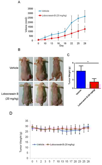CL1-5 cells (1 × 107/mouse) in 0.2 mL at 1:1 mixture of cultural medium and BD Matrigel Basement Membrane Matrix (BD Biosciences, Bedford, MA, USA) was inoculated subcutaneously into the flank of nude mice. When the tumor reached approximately 2 mm3 (at day 10 after cell inoculation), the mice were randomly divided into two groups (n = 6 each), and intraperitoneal (i.p.) injection included 20mg/kg Lobocrassin B or vehicle (10% DMSO + 90% glyceryl trioctanoate) (Sigma-Aldrich, St. Louis, MO, USA) every other day continuously for three weeks. During the Lobocrassin B administration, the body weight and tumor sizes (mm3) were recorded. The formula of length × (width)2 × 0.5 was applied to calculate the tumor size. At the end of treatment, all the mice were sacrificed after 28 days. The tumor tissues were measured weighted after being removed. The tumors were dissected and evaluated by immunoblotting as mentioned earlier.