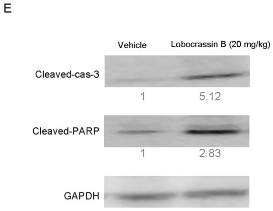 The inhibitory effect of Lobocrassin B on human lung cancer cell proliferation in vitro suggested that it might suppress tumor growth in vivo. To verify this hypothesis, nude mice were transplanted s.c. with CL1-5 cells, followed by 20 mg/kg Lobocrassin B treatment on day 10 after tumor injection. As shown in Figure 6A,B, Lobocrassin B administration significantly suppressed the growth of CL1-5 tumor in nude mice (p < 0.05). In addition, compared with the vehicle controls, Lobocrassin B significantly decreased the tumor weight on the 28 (p < 0.01; Figure 6C). The Lobocrassin B did not to influence the body weight of the mice compared with the vehicle treatment, which suggested limited side-effects (Figure 6D). Additionally, in the tumor tissues, Lobocrassin B treatment caused a significantly increased the cleaved caspase-3 and PARP expression compared with vehicle treatment (Figure 6E). These results suggested that Lobocrassin B also inhibits the lung cancer cells growth and induces apoptosis in vivo.