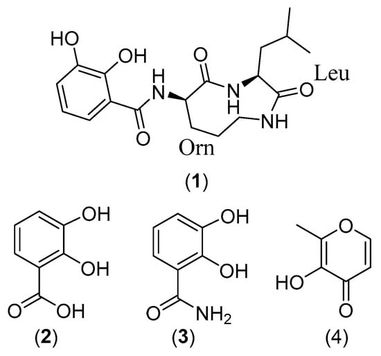 - Corbin, J.L.; Bulen, W.A. The isolation and identification of 2,3-dihydroxybenzoic acid and 2-N,6-N-di-92,3-dihydroxybenzoyl)-l-lysine formed by iron-deficient Azotobacter vinelandii. Biochemistry 1969, 8, 757–762. [Google Scholar] [CrossRef] [PubMed]