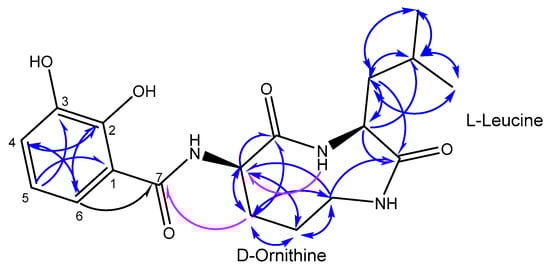 Compound 1 (1.8 mg, yield 0.49%) was purified as a colorless solid. The following NMR spectral data were acquired using a 600 MHz instrument: 1H, 13C, 13C-DEPT135 (Distortionless Enhancement by Polarization Transfer), 1H-1H COSY (correlation spectroscopy), 1H-1H NOESY (Nuclear Overhauser effect spectroscopy), 1H-13C HSQC (heteronuclear single quantum correlation), and 1H-13C HMBC (Heteronuclear Multiple Bond Correlation) (optimized to J = 8.3 Hz) in MeOD-d4, as well as 1H-13C HMBC (optimized to J = 8.3 Hz) in DMSO-d6 and tabulated in Table 1. The molecular formula was determined to be C18H25N3O5 (m/z 386.1692 [M + Na]+ calcd. for C18H25N3O5Na) from its HRESI-MS (High-Resolution Electrospray Ionization Mass Spectrometry) indicating eight degrees of unsaturation. The 1H spectrum displayed three aromatic protons at δH 6.98 (1H, d, J = 7.8 Hz), 6.71 (1H, t, J = 7.8, 15.8 Hz), and 7.34 (1H, d, J = 7.8 Hz) ppm, three methine protons at δH 1.89 (1H, m), 4.13 (1H, t, J = 5.6, 11.4 Hz), and 4.26 (1H, t, J = 8.5, 16.1 Hz), eight methylene protons at δH 3.51 (2H, t, J = 4.7, 8.9 Hz), 2.30 (1H, m), 2.02 (1H, m), 2.01 (1H, m), 1.94 (1H, m), 1.91 (1H, m), and 1.52 (1H, m) ppm, and six methyl protons at δH 0.96 (3H, d, J = 3.7 Hz) and 0.95 (3H, d, J = 3.7 Hz) ppm. 13C, 3C-DEPT135 and HSQC spectra displayed six aromatic carbons at δC 114.7, 119.6, 121.3, 121.9, 147.0, and 151.7 ppm; three ester/amide-type carbonyls at δC 168.3, 172.8, and 174.2 ppm; three methine carbons at δC 60.3, 54.6, and 25.8 ppm; four methylene carbons at δC 23.7, 29.1, 39.4, and 46.4 ppm; and two methyl carbons at δC 22.2 and 23.2 ppm. The three aromatic protons at δH 6.98, 6.71, and 7.34 ppm were assigned to H-4, H-5, and H-6, respectively by COSY spectrum and indicated an adjacent three-substitution aromatic system as part of the structure. The deshielded carbon resonances at δC 151.7 and 147.0 ppm suggested two hydroxyl substitutions on the aromatic ring, and were assigned to C-2 and C-3 respectively, with the correlations observed amongst H-4, H-5, and H-6 in the HMBC spectrum (Figure 2). The other aromatic carbon resonances at δC 114.7, 121.3, 119.6, 121.9 ppm were attributed to C-1, C-4, C-5, C-6, respectively according to the cross-peaks observed in the HSQC and HMBC spectra. The strong correlation observed in the HMBC spectrum between H-6 and one of the ester/amide-type carbonyls at δC 174.2 ppm has assigned δC 174.2 to C-7 (Figure 2). The HSQC and HMBC spectra also exhibited standard resonance signals for amino acids by the observation of two α-methines signals at δH 4.26 (1H, t, J = 8.5, 16.1 Hz), 4.13 (1H, t, J = 5.6, 11.4 Hz) with their connected deshielded carbons at δC 60.3 and 54.6 ppm, respectively, as well as HMBC cross-peaks between the α-protons and ester/amide-type carbonyls at δC 172.8 and 168.9 ppm (Figure 2). Analysis of the COSY, HSQC, and HMBC data, as well as degrees of unsaturation assigned one ornithine and one leucine moiety presented in a cyclic nature. The connection between the aromatic part and the cyclic peptide moiety was confirmed by the correlation displayed in HMBC (using DMSO-d6 as solvent) between Orn β-H and C-7 (Figure 2). The proton and carbon resonances were also compared to the human metabolites database (HMDB) with ornithine and leucine individually, as well as 2,3-dihydroxybenzamide-scaffold with compound 2 and literature [24], and they showed consistent results. The absolute configuration of leucine and ornithine was determined by acid hydrolysis followed by Marfey’s derivatization and comparison to their analogues of the authentic amino acids by HPLC analysis. The Marfey’s analysis of compound 1 revealed the absolute configuration of leucine to be l and ornithine to be d-configuration. Compound 1 was identified as 2,3-dihydroxy-N-((3S,6R)-3-isobutyl-2,5-dioxo-1,4-diazonan-6-yl) benzamide, a new cyclic dipeptide, and given the name petrocidin A.