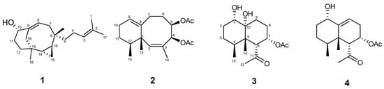 - Duh, C.-Y.; Wang, S.-K.; Weng, Y.-L. Brassicolene, a novel cytotoxic diterpenoid from the Formosan soft coral Nephthea brassica. Tetrahedron Lett. 2000, 41, 1401–1404. [Google Scholar] [CrossRef]