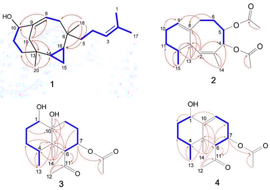 Selected 1H-1H COSY (blue bold lines) and HMBC (red arrows) correlations of 1–4.