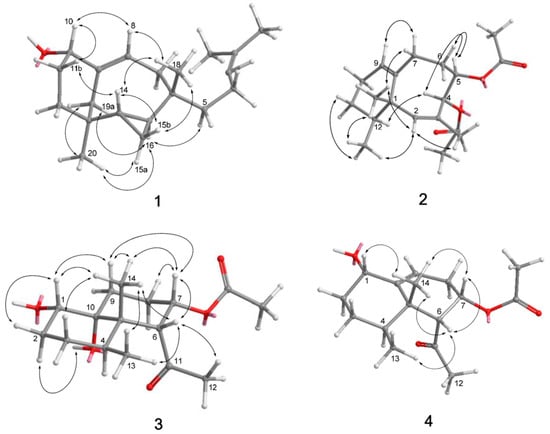 Parathyrsoidin F (3) was obtained as a colorless oil. The HRESIMS of 3 established the molecular formula C16H26O5, implying four degrees of unsaturation. The DEPT spectrum (Table 2) of 3 evidenced four methyl, four sp3 methylene, three sp3 methine, two sp3 quaternary, and two carbonyl carbons. In turn, the 1H and 13C NMR (Table 2 and Table 3) (Figures S13 and S14) spectra showed the presence of (a) a secondary methyl (δC 15.5 CH3; δH 0.35 d, J = 7.2 Hz), (b) a tertiary methyl (δC 16.4 CH3; δH 0.54 s), (c) a secondary hydroxyl on C-1 (δC 71.7 CH; δH 3.32 brs), (d) a tertiary hydroxyl on C-10 (δC 72.6 C, (e) a COCH3 group at C-6 (δC 214.3 CO, 34.3 CH3; δH 1.82 s), and (f) an acetate at C-7 (δC 169.1 CO, 20.6 CH3; δH 1.52 s). IR absorption at 3421 cm−1 and two absorptions at 1736 and 1714 cm−1 and the NMR signals indicated the presence of a hydroxyl, an acetate, and a methyl ketone (Table 2 and Table 3). The structure of 3 was determined by COSY (Figure 2 and Figure S15) and HMBC correlations (Figure 2 and Figure S17), and the latter correlations determined the acetate to be at C-7 (71.6 CH). The relative configuration of 3 was established from NOESY cross-peaks (Figure 3 and Figure S18). Assuming the β-orientation of H3-14 (δ 0.54 s), which exhibited NOESY correlations with H-1 (δ 3.32, d, J = 5.2 Hz), H-6 (δ 2.99, d, J = 6.8 Hz), H-7 (δ 5.16, ddd, J = 12.4, 6.8, 4.8 Hz), and H3-13 (δ 0.35, d, J = 7.2 Hz), the β-orientation of H-1, H-6, H-7, and H3-14 were suggested (Figure 3). One of the methylene protons at C-2 (δ 1.75, m) exhibited a NOESY correlation with H-1 and was identified as H-2β, while the other (δ 1.92, m) was assigned to H-2α. The NOESY correlation observed between H-2α and 10-OH (δ 6.68, d, J = 1.2 Hz) indicated the α-orientation of the 10-OH.