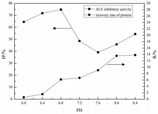 Effects of pH values on recovery rate of protein and angiotensin-I-converting enzyme (ACE) IP of elution fractions.