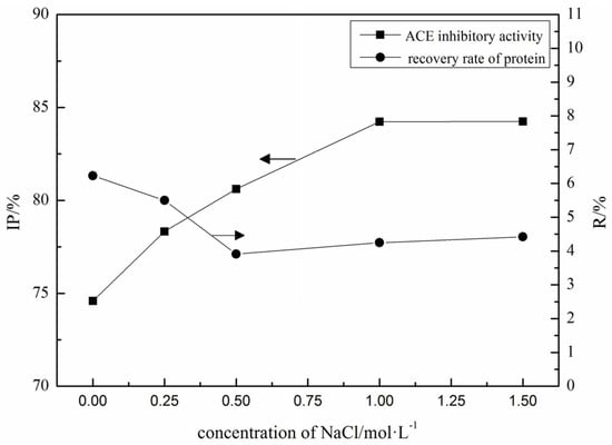 Effects of NaCl concentration in equilibrating buffer on the recovery rate of protein and ACE inhibitory activity of elution fractions.