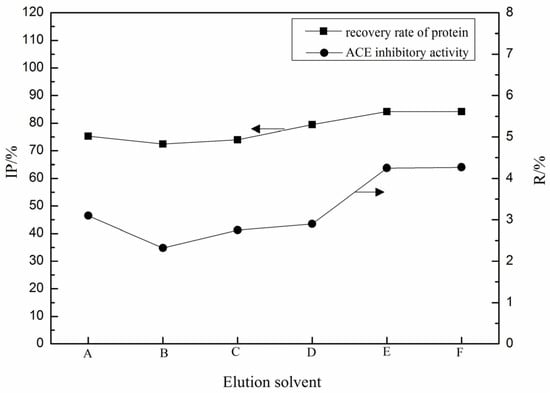 Effects of eluent on the recovery rate of protein and ACE inhibitory activity of immobilized metal affinity chromatography (IMAC) fractions by using phosphate-buffered saline (PBS) buffer (pH 6.8, 0.5 M NaCl) as equilibration buffer: (A) iminazole; (B) 0.02 mol·L−1 sodium phosphate buffer at pH 6.0; (C) 0.02 mol·L−1 sodium phosphate buffer at pH 5.0; (D) 0.02 mol·L−1 sodium phosphate buffer at pH 4.0; (E) 0.02 mol·L−1 sodium phosphate buffer at pH 4.0, containing 0.50 mol·L−1 NaCl; and (F) 0.02 mol·L−1 sodium phosphate buffer at pH 4.0, containing 1.0 mol·L−1 NaCl.