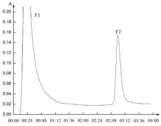 According to the above results, 0.02 M phosphate buffer at pH 6.8, containing 1 M NaCl was selected as the equilibrating buffer, and 0.02 M phosphate buffer at pH 4.0, containing 0.5 M NaCl was selected as the elution buffer. Under this condition, LFPH-I was fractionated to two peaks (fraction 1 and fraction 2) (Figure 4). The crude protein LFPH-I and eluted peptides (Fraction 2) with IC50 of 0.123 mg∙mL−1 and 0.116 mg∙mL−1, respectively. The IC50 values of the eluted peptides F2 (Fraction 2) obtained after the separation of LFPH-I by AS-IDA-Ni2+ had 13.82% lower than crude protein LFPH-I. The activity of enrichment of components increased, which indicates that AS-IDA-Ni2+ can enrich active components.