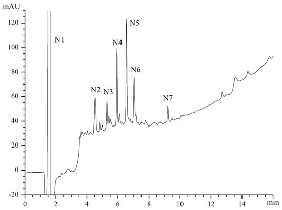 F2 was further separated by RP-HPLC on a Zorbax SB C18 column. The RP-HPLC profile of the fractions collected from F2 was shown (Figure 5). Among those fractions separated by RP-HPLC, fraction N5 showed the highest ACE inhibitory activity, with IC50 value of 0.031 mg∙mL−1 (52 μM) (Table 2), and was collected for amino acid sequence analysis.