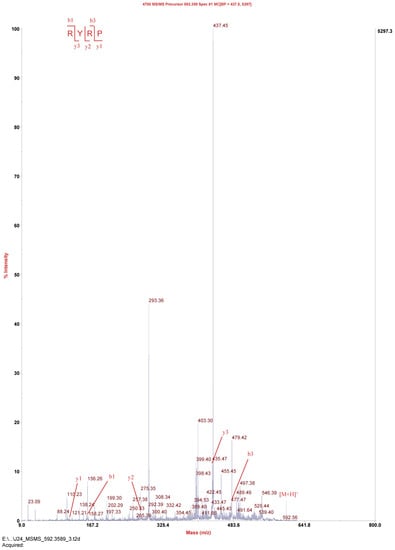 The amino acid sequences of the active fraction N5 were identified as Arg-Tyr-Arg-Pro (RYRP). The molecular mass (592.0 Da) corresponded to its sequence (Figure 6). The quantitative structure–activity relationship (QSAR) of ACE inhibitory peptides indicates that ACE inhibition of the peptides relates to their amino acid sequences—the C-terminal region of the peptide plays a predominant role in binding to the enzyme. The research suggested that hydrophobic amino acids or aromatic amino acids in the C-terminal will be preferred for increasing the peptide activity. On the other hand, C-terminal with positively charged amino acids such as lysine (K) and arginine (R) may contribute to an increase in the ACE inhibitory potential. In the current study, RYRP is composed of four amino acid residues with hydrophobic residue, proline as the C-terminal residue, exhibiting strong ACE-inhibitory activity (IC50 of 52 μM). Its ACE inhibitory activity was stronger than RVCLP [23], but weaker than SPRCR [22]. This phenomenon is in accordance with the QSAR studies. Meanwhile, the IC50 value of RYRP falls within 0.3 to 1500 μM, which is the range of IC50 values of ACE inhibitor peptides from marine proteins [24].