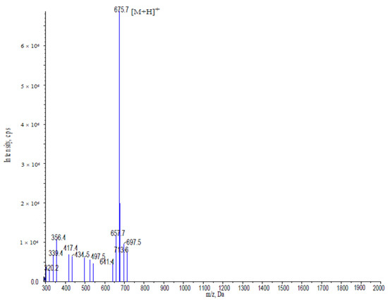 The Meretrix meretrix was hydrolyzed by pepsin, alkaline, protease, neutral protease, papain, and trypsin. The best hydrolysis process was determined by orthogonal testing, including temperature, time, dose, pH, and feed solution proportion. The best hydrolysis conditions based on an index of triglyceride content were a temperature of 40 °C, time of 8 h, alcalase enzyme dosage of 1000 U/g, pH 9.5, and a solid-liquid ratio of 1:2. Meretrix meretrix oligopeptides (MMO) was identified by a LTQ-Orbitrap mass spectrometer (Thermo, Waltham, MA, USA) coupled with an electrospray ionisation (ESI) source. The molecular mass of MMO was determined by the doubly charged (M + 2H)+2 state peak in the mass spectrum. MMO was sequenced on a Shimadzu PPSQ-31A automated gasphase sequencer (Shimadzu, Kyoto, Japan). It was dissolved in 20 µL of a 37% CH3CN (v/v) solution and applied to TFA-treated glass fiber membranes, precycled with Polybrene (Shimadzu, Kyoto, Japan). Data were recorded using the Shimadzu PPSQ-31A software. The amino acid sequence of the MMO was Gln-Leu-Asn-Trp-Asp, and its molecular mass was 675.7 Da (Figure 1).