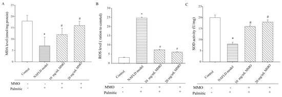 Effects of MMO on oxidative stress on NAFLD model cells. The NAFLD model cells were treated with MMO (10 and 20 mg/mL) for 24 h. (A) The level of MDA was detected by using the MDA detection kit; (B) the level of ROS was detected by using the ROS detection kit; (C) the level of SOD was detected by using the SOD detection kit. Data are presented as mean ± S.D. for three independent experiments with triplicate determination.* p < 0.05 as compared with control. # p < 0.05 as compared with NAFLD model.