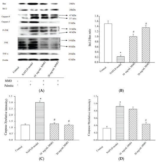 The above findings indicated that MMO alleviated cell death by suppressing apoptosis and alleviating oxidative stress in the NAFLD model cells. To determine whether the protective effects of MMO in the NAFLD model cells were associated with the cell death-related pathways leading to the recovery of normal hepatic function, we measured the expression of Bax and Bcl-2, JNK phosphorylation, caspase-3, caspase-9, and TNF-α activity. Bax expression (Figure 7A,B), JNK, and P-JNK (Figure 7A,C), TNF-α, caspase-9, and caspase-3 activity (Figure 7D) were enhanced in the NAFLD model cells, and Bcl-2 expression was decreased compared with the control cells. Current evidence suggests that JNK is activated and induces apoptosis in NAFLD model cells, which is relieved by MMO treatment. JNK activation induces mitochondrial dysfunction and apoptosis [29]. Cell apoptotic signaling is thought to be induced by oxidative stress [30]. Oxidative stress activates JNK signaling, which in turn induces apoptosis via Bax [30]. Apoptotic stimuli promote the translocation of mitochondrial Bax, which is a pro-apoptotic Bcl-2 family of proteins that decreases the mitochondrial membrane potential (MMP) and promotes the generation of ROS [31]. Apoptotic signaling is activated when Bax migrates to the mitochondrial surface [32], promotes cyt-c and AIF release from the mitochondria to the cytosol [33], cleaves procaspase-9 to caspase-9, and activates caspase-3 to promote cell death [34]. The present study demonstrated that the protective effects of MMO on NAFLD model cells may be due to the inhibition of pro-apoptotic pathway activation; antioxidant activity to decrease ROS, matrix metalloprotease, and TNF-α formation; and decreased JNK pathway activation.