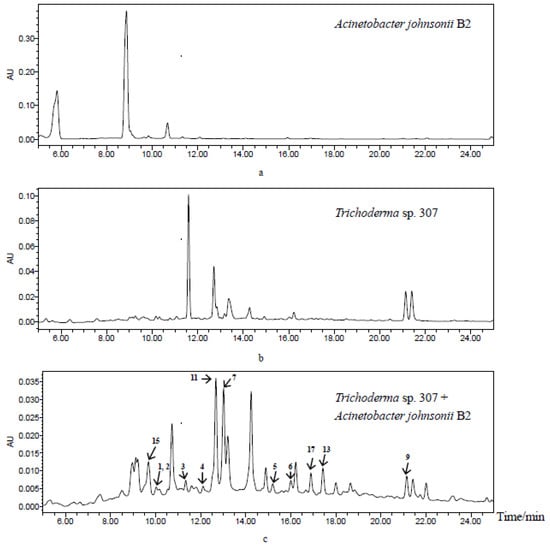 HPLC profiles of secondary metabolites from Acinetobacter johnsonii B2 (a), Trichoderma sp. 307 (b) and co-cultivation of two microorganisms (c) from up to down (detection wavelength: 254 nm).