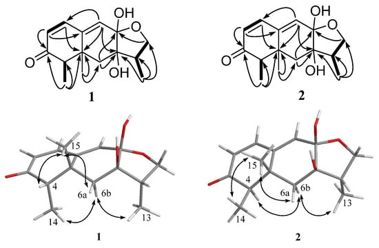 Key HMBC (black arrows), 1H-1H COSY (bold lines), and NOESY (double arrows) correlations of compounds 1 and 2.