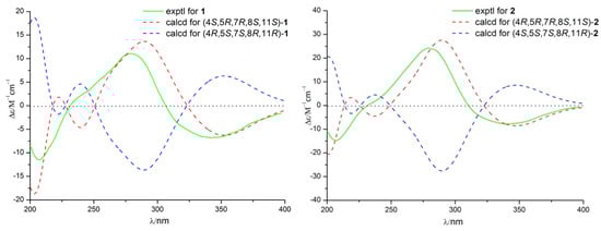 Calculated and experimental ECD spectra of compounds 1 and 2.