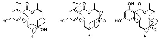 Key HMBC (black arrows) and 1H-1H COSY (bold lines) correlations of compounds 4, 5, and 6.