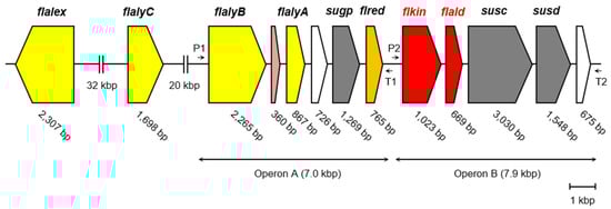 Under these circumstances, DEH reductase, KDG kinase, and KDPG aldolase were recently characterized in S. degradans 2-40T, a member of the phylum Proteobacteria [25]. The combined action of these enzymes could convert DEH to pyruvate and GAP in vitro. On the other hand, we also found the existence of alginate-assimilating gene cluster in the genome of Flavobacterium sp. strain UMI-01, a member of the phylum Bacteroidetes [27,28]. The endolytic and exolytic alginate lyase genes, flalyA and flalyB, and a DEH reductase gene, flred, are located in operon A, and KDG kinase-like gene flkin (GenBank accession number, BAQ25538) and KDPG aldolase-like gene flald (GenBank accession number, BAQ25539) are in operon B (Figure 1). The alginate lyases and DEH reductase of this bacterium have already been characterized [26,27,28]; however, KDG kinase and KDPG aldolase have not been identified yet. The amino acid sequences deduced from flkin and flald showed only 19% and 22% identities, respectively, with those of the corresponding enzymes from S. degradans 2-40T [25]. These low sequence identities suggest that the properties of Flavobacterium (Bacteroidetes) enzymes may be somewhat different from those of Saccharophagus (Proteobacteria) enzymes. Therefore, in the present study, we first characterized the primary structures of KDG kinase and KDPG aldolase, FlKin and FlAld, of the strain UMI-01 compared with those of other bacterial enzymes. Then, we investigated enzymatic properties of proteins encoded by flkin and flald using recombinant enzymes, recFlKin and recFlAld. Furthermore, we constructed an in vitro alginate-metabolizing system using recFlKin and recFlAld, along with recombinant alginate lyases and DEH reductase of this bacterium to confirm that this enzyme system can produce pyruvate and GAP from alginate in vitro.