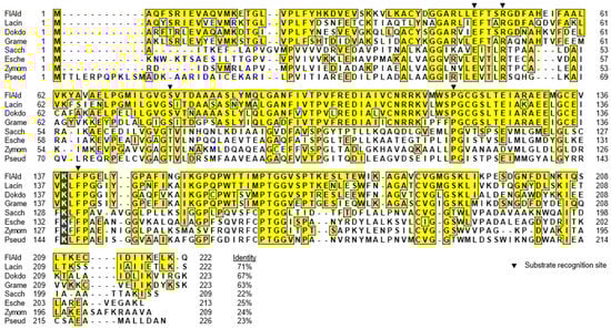 Multiple alignment for amino acid sequences of FlAld and other KDPG aldolases. Gray box and closed triangles indicate catalytic and substrate-recognition residues of KDPG aldolase from E. coli [44,45], respectively. FlAld, KDPG aldolase from Flavobacterium sp. strain UMI-01 (GenBank accession number, BAQ25539); Lacin, KDPG aldolase-like protein from Lacinutrix sp. 5H-3-7-4 (GenBank accession number, AEH01606); Dokdo, KDPG aldolase-like protein from Dokdonia sp. MED134 (GenBank accession number, WP_013749799); Grame, KDPG aldolase-like protein from G. forsetii KT0803 (GenBank accession number, CAL66136); Sacch, KDPG aldolase from S. degradans 2-40T (GenBank accession number, ABD80644) [25]; Esche, KDPG aldolase from E. coli (GenBank accession number, WP_000800517) [44,45]; Zymom, KDPG aldolase from Zymomonas mobilis (GenBank accession number, S18559) [44]; Pseud, KDPG aldolase from Pseudomonas putida (GenBank accession number, WP_016501275) [44,46].