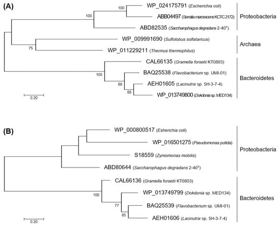 Deduced amino acid sequences of flkin and flald were compared with those of KDG kinases and KDPG aldolases from several Proteobacteria and Bacteroidetes species. Enzymes from two Archaea species are also included in the comparison of KDG kinases. FlKin showed considerably low amino acid identity (15%–26%) with KDG kinases from Proteobacteria species, i.e., Escherichia coli (GenBank accession number, WP_024175791) [38], Serratia marcescens (GenBank accession number, ABB04497) [39], and S. degradans 2-40T (GenBank accession number, ABD82535) [25], and archaea, i.e., Sulfolobus solfataricus (GenBank accession number, WP_009991690) [40,41,42] and Thermus thermophiles (GenBank accession number, WP_011229211) [43] (Figure 2). Meanwhile, the sequence of FlKin showed relatively high identities (47%–68%) with the enzymes from Bacteroidetes species, i.e., Gramella forsetii KT0803 (GenBank accession number, CAL66135), Dokdonia sp. MED134 (GenBank accession number, WP_016501275), and Lacinutrix sp. 5H-3-7-4 (GenBank accession number, AEH01605). However, substrate-recognition residues of KDG kinase, which were identified in the S. solfataricus enzymes [42], i.e., Gly34, Tyr90, Tyr106, Arg108, Arg166, Asp258, and Asp294, were entirely conserved in FlKin as Gly34, Tyr89, Tyr104, Arg106, Arg169, Asp280, and Asp317, respectively. FlAld also showed low amino acid identity (22%–25%) with KDPG aldolases from Proteobacteria species such as E. coli (GenBank accession number, WP_000800517) [44,45], Zymomonas mobilis (GenBank accession number, S18559) [44], Pseudomonas putida (GenBank accession number, WP_016501275) [44,46], and S. degradans 2-40T (GenBank accession number, ABD80644) [25] (Figure 3). Meanwhile, the sequence identities between FlAld and enzymes from other Bacteroidetes species such as G. forsetii KT0803 (GenBank accession number, KT0803), Dokdonia sp. MED134 (GenBank accession number, WP_013749799), and Lacinutrix sp. 5H-3-7-4 (GenBank accession number, AEH01606) were 61%–65%. Catalytic residue Lys133 and substrate-recognition residues, Glu45, Arg49, Thr73, Pro94 and Phe135 identified in the E. coli enzyme [45], were conserved in FlAld except for the substitution of Thr73 by Ser. Phylogenetic analyses for KDG kinases and KDPG aldolases (Figure 4A,B) suggested that the Bacteroidetes enzymes are somewhat phylogenetically deviated from the Proteobacteria (and Archaea) enzymes. Therefore, we decided to examine if FlKin and FlAld of the strain UMI-01 actually possess KDG kinase and KDPG aldolase activities.