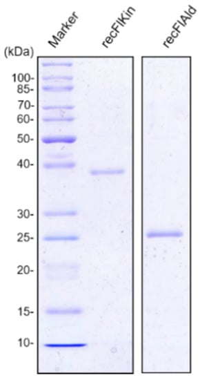 SDS-PAGE for recFlKin and recFlAld. Recombinant enzymes were purified Ni-NTA affinity chromatography and subjected to 0.1% SDS–10% polyacrylamide-gel electrophoresis. Proteins in the gel were stained by Coomassie Brilliant Blue R-250. Marker, molecular weight markers (Protein Ladder Broad Range, New England Biolabs, Ipswich, MA, USA).