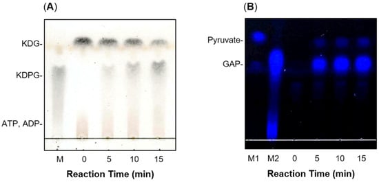 Thin-layer chromatography (TLC) analyses for reaction products of recFlKin and recFlAld. (A) Reaction products produced by recFlKin. The reaction products were visualized by spraying 10% (v/v) sulfuric acid in ethanol followed by heating at 130 °C for 10 min. M, standard KDPG; (B) Reaction products of recFlAld. The reaction products were visualized with 0.5% (w/v) 2,4-dinitrophenylhydrazine (DNP)–20% (v/v) sulfuric acid. The color was graphically inverted to ease the recognition of spots. M1, standard pyruvate; M2, standard glyceraldehyde-3-phosphate (GAP). Stained materials near the original position are GAP oligomers.