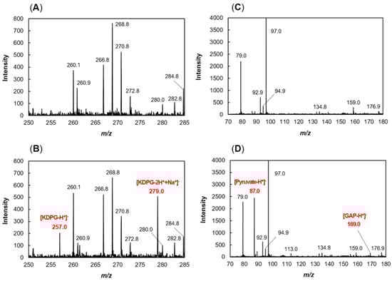Mass spectrometry for reaction products of recFlKin and recFlAld. The reaction products prepared as in Section 4.10 were subjected to matrix-assisted laser desorption ionization-time of flight mass spectrometer (MALDI-TOF) mass spectrometry, and analyzed by negative-ion mode. (A,B) KDG before and after the recFlKin reaction, respectively; (C,D) KDPG before and after the recFlAld reaction, respectively. Reaction products are indicated with red letters along with molecular masses above the peaks.