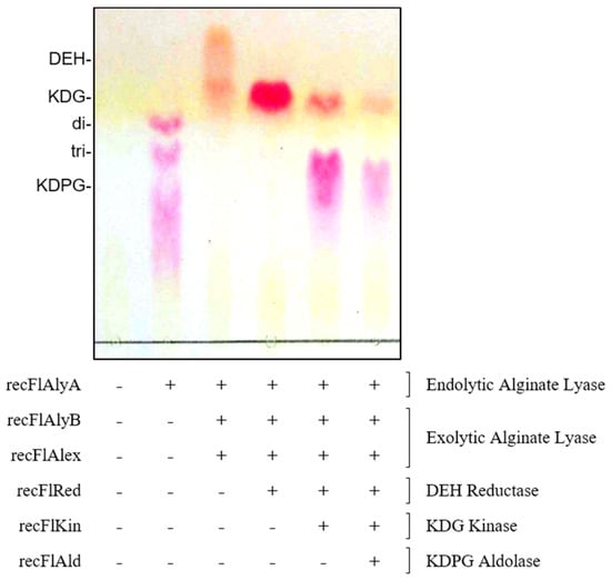 In the present study, we identified flkin and flald in the genome of strain UMI-01 as KDG kinase and KDPG aldolase gene, respectively. Since alginate lyases and DEH reductase in this strain have already been characterized [26,27,28], here we examined if the sequential action of these alginate-degrading and -assimilating enzymes could convert alginate to pyruvate and GAP in vitro. Namely, recombinant alginate lyases (recFlAlyA, recFlAlyB, and recFlAlex) [26,27], DEH reductase (recFlRed) [28], KDG kinase (recFlKin), and KDPG aldolase (recFlAld) were allowed to react alginate in various combinations, and each reaction product was analyzed by TLC (Figure 8) and quantified by thiobarbituric acid (TBA) and LDH–NADH methods (Table 2). As shown in Figure 8, alginate was almost completely degraded to DEH by the simultaneous actions of recFlAlyA, recFlAlyB, and recFlAlex. The DEH was also almost completely reduced to KDG by recFlRed. Furthermore, a major part of the KDG was converted to KDPG by recFlKin, and the band of KDPG became faint by the reaction of recFlAld. This indicated the splitting of KDPG to pyruvate and GAP by the action of recFlAld. Accordingly, the sequential action of recombinant enzymes was considered to be capable of converting alginate to pyruvate and GAP in vitro. Then, the yields of intermediates in each reaction step were quantified by TBA and LDH–NADH methods (Table 2). Concentrations of the unsaturated oligo-alginates, DEH, KDG, KDPG, and pyruvate (and GAP), were determined to be 4.2 mM, 9.8 mM, 9.8 mM, 8.1 mM, and 3.8 mM, respectively. Since the initial concentration of alginate (0.2% (w/v)) corresponds to 10 mM monosaccharide, the yields of DEH and KDG were estimated to be ~100%, and the yields of KDPG and pyruvate were estimated to be ~80% and ~40%, respectively. These results indicated that high-value intermediates such as KDPG could be produced from alginate with fairly high efficiency by the recombinant enzymes of the strain UMI-01 in vitro.