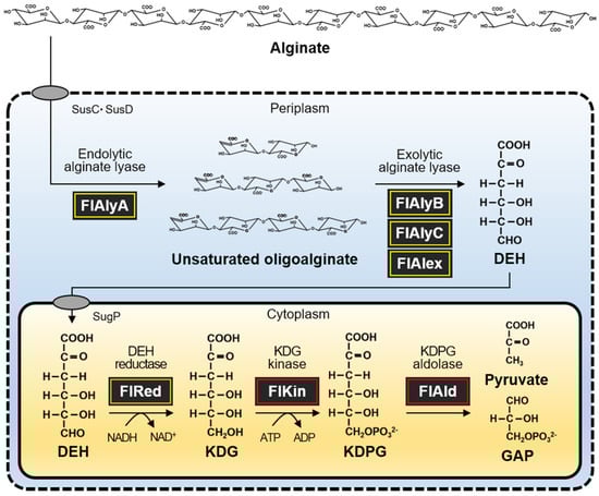 Alginate is an acidic heteropolysaccharide comprising two kinds of uronic acid, β-d-mannuronate and α-l-guluronate [1,2,3]. This polysaccharide exists as a structural material in cell-wall matrices of brown algae and biofilms of certain bacteria. Since alginate solution shows high viscosity and forms an elastic gel upon chelating Ca2+, it has long been used as viscosifier and gelling agent in the fields of food and pharmaceutical industries. Alginate oligosaccharides produced by alginate lyases have also been recognized as functional materials since they exhibit various biological functions; e.g., promotion of root growth in higher plants [4,5], acceleration of growth rate of Bifidobacterium sp. [6], and promotion of penicillin production in Penicillium chrysogenum [7]. Anti-oxidant [8], anti-coagulant [9], anti-inflammation [10], and anti-infectious disease [11] are also bioactivities of alginate oligosaccharides. Recently, 4-deoxy-l-erythro-5-hexoseulose uronic acid (DEH), an end reaction product of alginate lyases, was proven to be available as a carbon source for ethanol fermentation by the genetically modified microbes [12,13,14]. Furthermore, 2-keto-3-deoxyaldonic acids like 2-keto-3-deoxy-d-gluconate (KDG) and 2-keto-3-deoxy-6-phosphogluconate (KDPG), which are intermediates in alginate metabolism, have been expected as leading compounds for antibiotics, antiviral agents, and other drugs and medicines [15]. Thus, such alginate-derived products are regarded as promising materials in various practical applications.