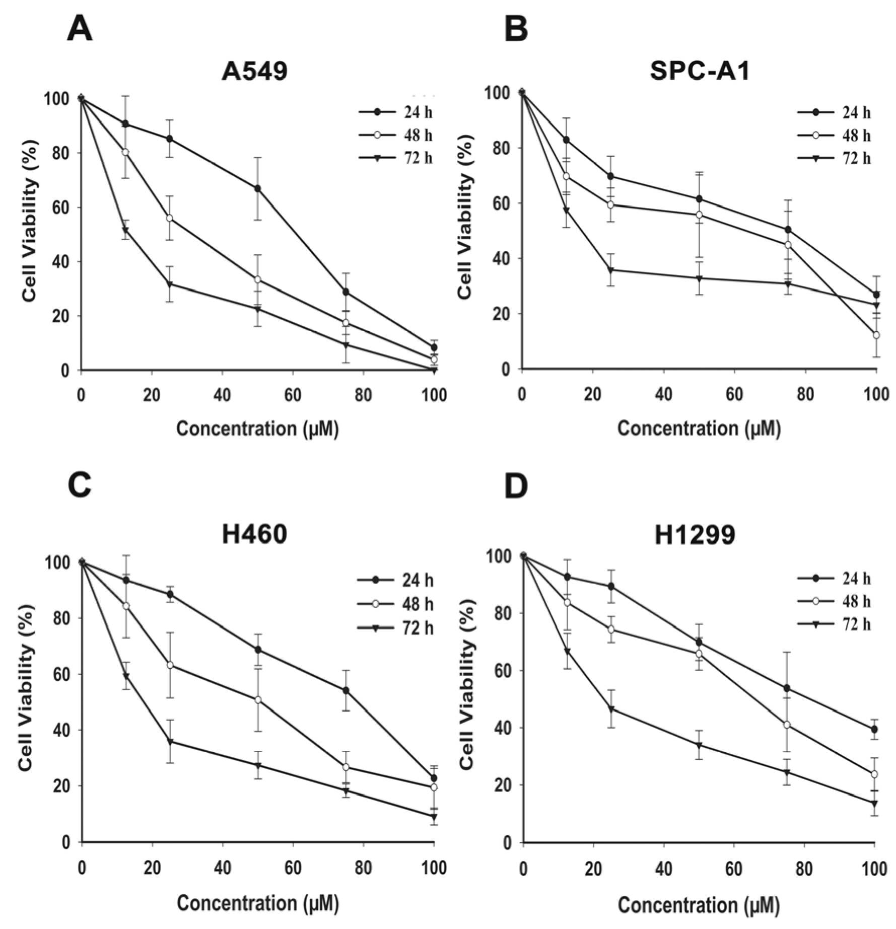 Effects of FX on proliferation of human NSCLC cells. Cytotoxicity of FX was assayed by CCK-8 method. A549 (A), SPC-A1 (B), H460 (C) and H1299 (D) cells were grown in a 96-well plate and exposed to various concentrations of FX (0, 12.5, 25, 50, 75 and 100 μM) for 24, 48 and 72 h. Data are presented as means ± SD (n = 3).