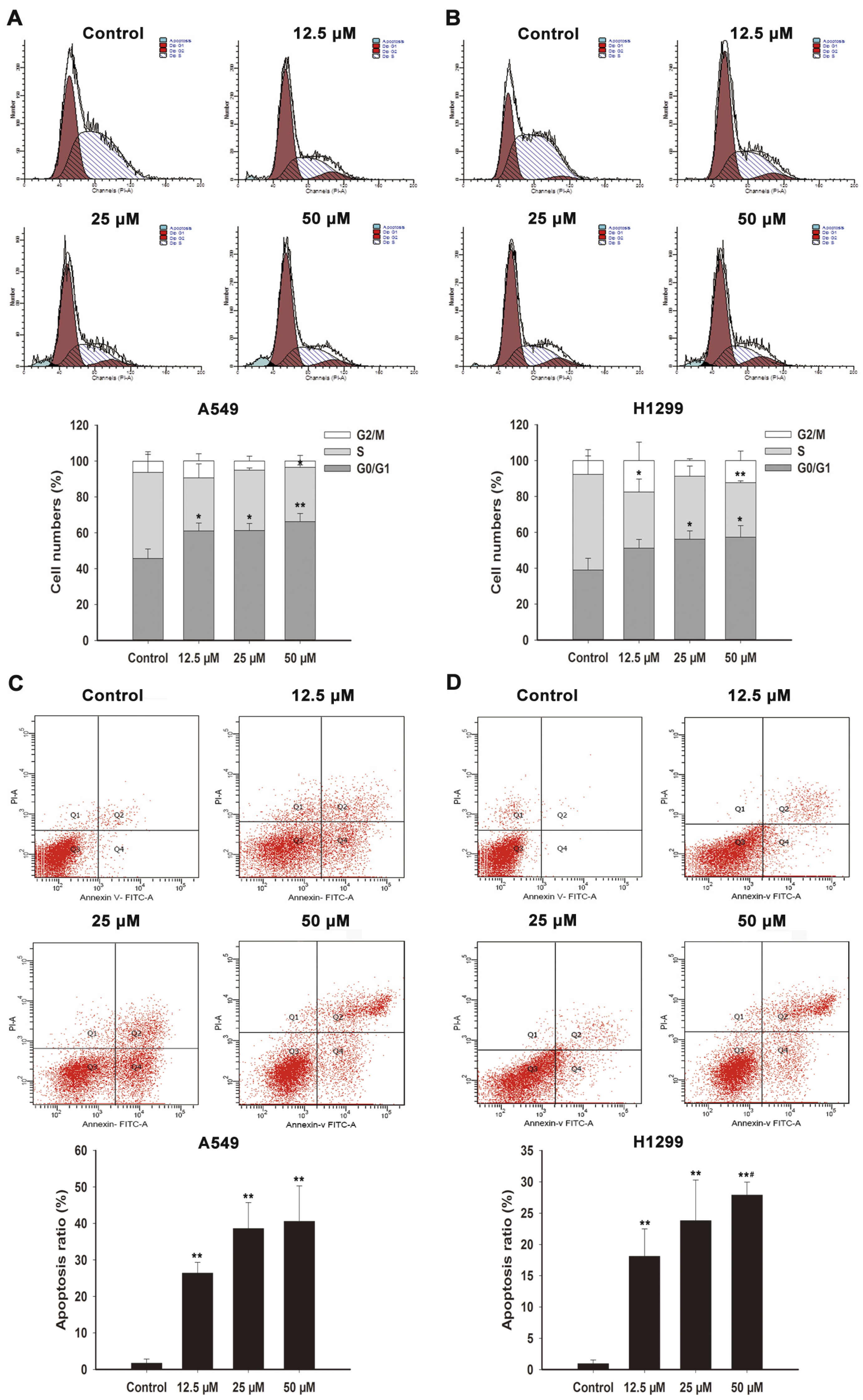 Induction of G0/G1 arrest and apoptosis by FX in A549 and H1299 cells. A549 (A) and H1299 (B) cells after the 48-h treatment of FX were stained with PI, then DNA content was analyzed by flow cytometry. G0/G1, S and G2/M indicate different cell cycle phases. Annexin V-FITC/PI staining assay of A549 (C) and H1299 (D) cells was analyzed by flow cytometry to detect apoptosis after FX treatment for 48 h and Q4 represent cells in apoptotic stage. Data are presented as means ± SD (n = 3). * p < 0.05, ** p < 0.01 compared to the control group, # p < 0.05, compared to the FX 12.5 μM treatment group.