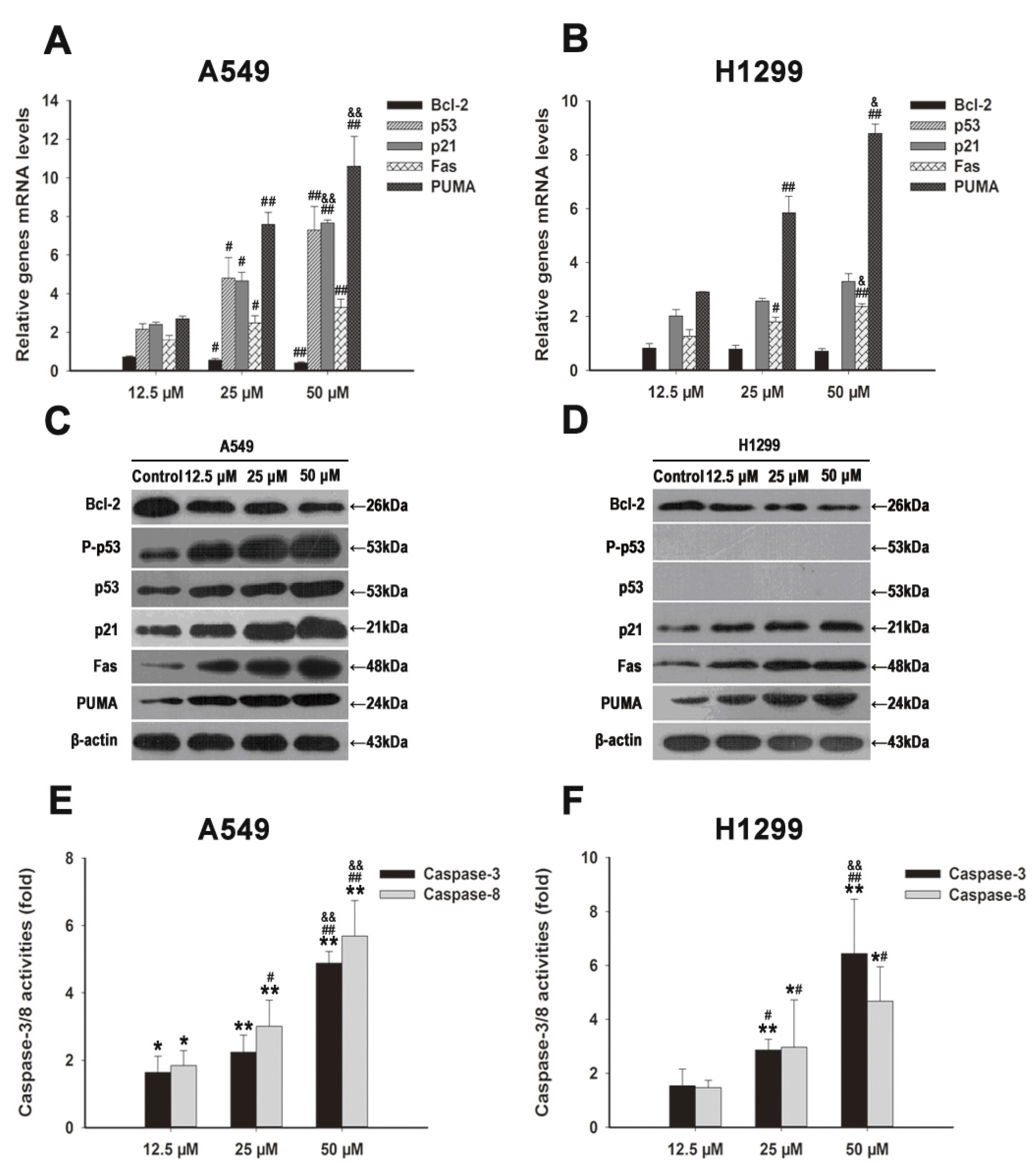 FX induced G0/G1 arrest and apoptosis through regulating p21waf1/cip1, p53, Bcl-2, PUMA and Fas. Total cell RNA was extracted from A549 (A) and H1299 (B) cells after treating with FX (0, 12.5, 25, 50, 75 and 100 μM) for 48 h. Corresponding mRNA levels of p53, p21waf1/cip1, Bcl-2, PUMA and Fas genes were determined using qRT-PCR. Results were shown as the relative expression ratio of genes in A549 and H1299 cells, respectively. Western blot analysis of cell cycle arrest and apoptosis related proteins: p53, P-p53, PUMA, p21waf1/cip1, Fas and Bcl-2, were performed after A549 (C) and H1299 (D) cells harvested after exposing to various concentrations of FX (0, 12.5, 25, 50 μM). Effects of FX on caspase-3/8 activities in A549 (E) and H1299 (F) cells were measured after 48 h of exposure similar to panel C/D by colorimetric method. When presented, means and standard deviations were obtained from three independent experiments. * p < 0.05, ** p < 0.01 compared to the control group; # p < 0.05, ## p < 0.01 compared to the FX 12.5 μM group; & p < 0.05, && p < 0.01 compared to the FX 25 μM group.
