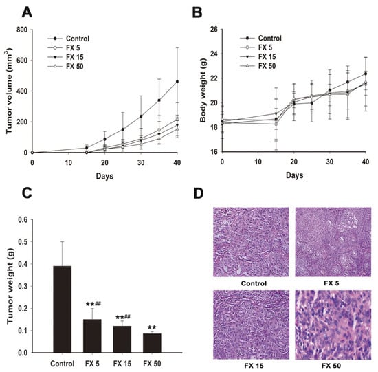 2.6. FX Inhibits Human NSCLC A549 Tumor Xenograft Growth in Nude Mice