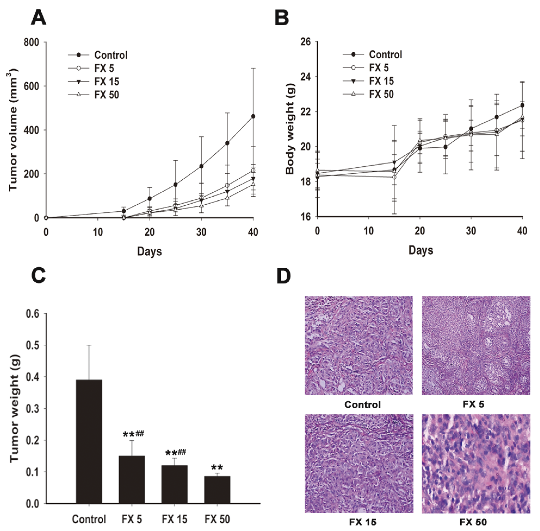 FX inhibits A549 tumor xenograft growth in vivo. The cells were subcutaneously injected into the left back of nude mice to induce tumor xenografts. Mice were gavaged with blank soybean oil, 5, 15 and 50 mg/kg FX once daily for five weeks. Tumor volumes (A), bodyweights (B) and tumor weights (C) were determined. Data are expressed as means ± SD (n = 8). ** and ## denote statistically significance (p < 0.01) compared to the control and FX 50 mg/kg groups, respectively. (D) Tumor morphology in the nude mice with xenografted A549 cells was examined by hematoxylin and eosin staining. Magnification: 400×. FX 5, FX 15 and FX 50 mean 5, 15, 50 mg/kg FX, respectively.