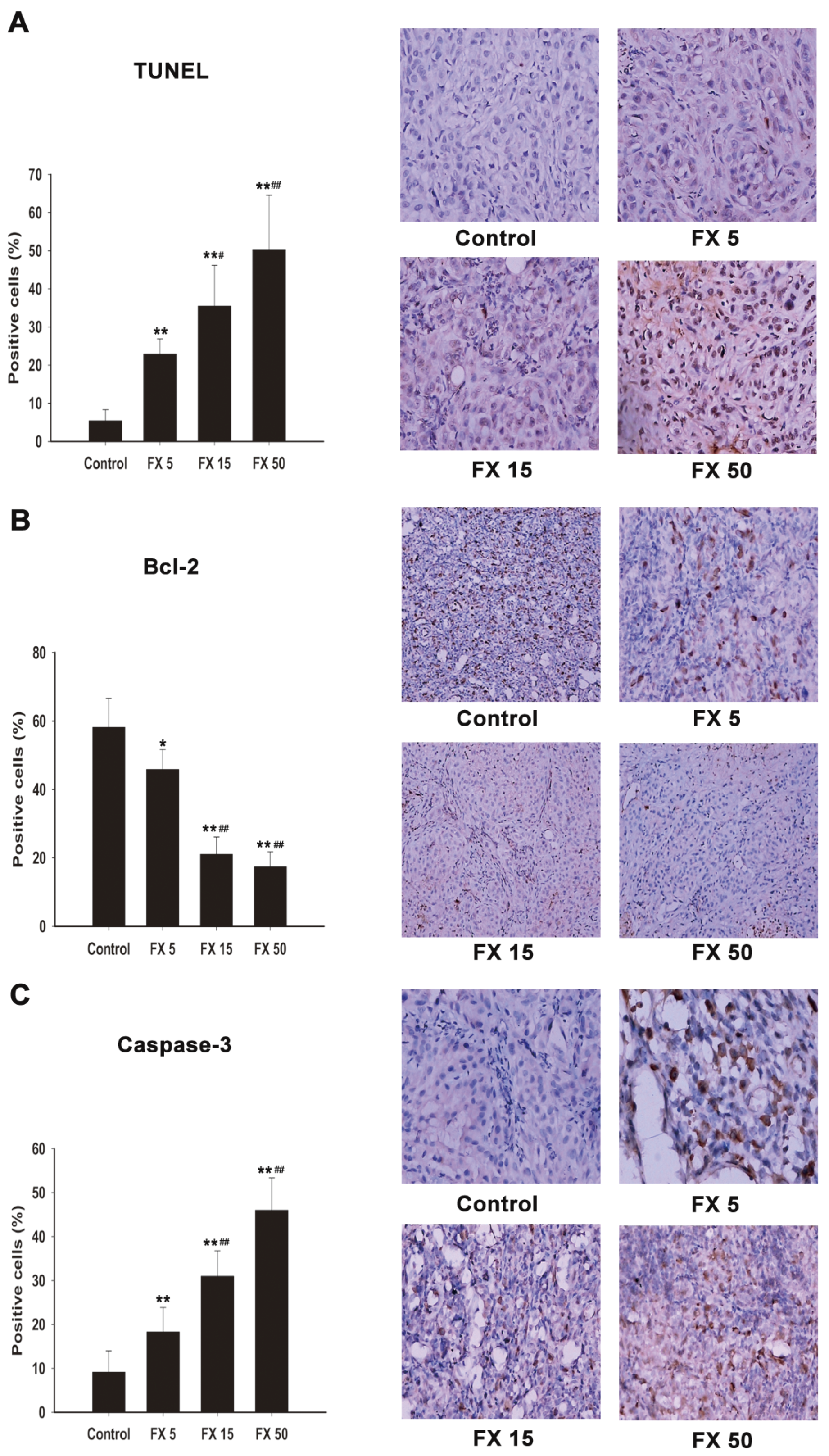 Effects of FX on the protein expression of Bcl-2 and Caspase-3 and apoptosis rates in A549 xenograft tumors. (A) TUNEL staining; Bcl-2 (B); and Caspase-3 (C) immunohistochemical staining. Magnification: 400×. FX 5, FX 15, FX 50 mean 5, 15 and 50 mg/kg FX respectively. Data are expressed as means ± SD (n = 5). * p < 0.05, ** p < 0.01 compared to the control group; # p < 0.05, ## p < 0.01 compared to the FX 5 mg/kg group.